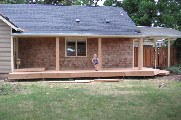 We designed a larger deck and beefed the supporting posts to allow the removal of one of them. |